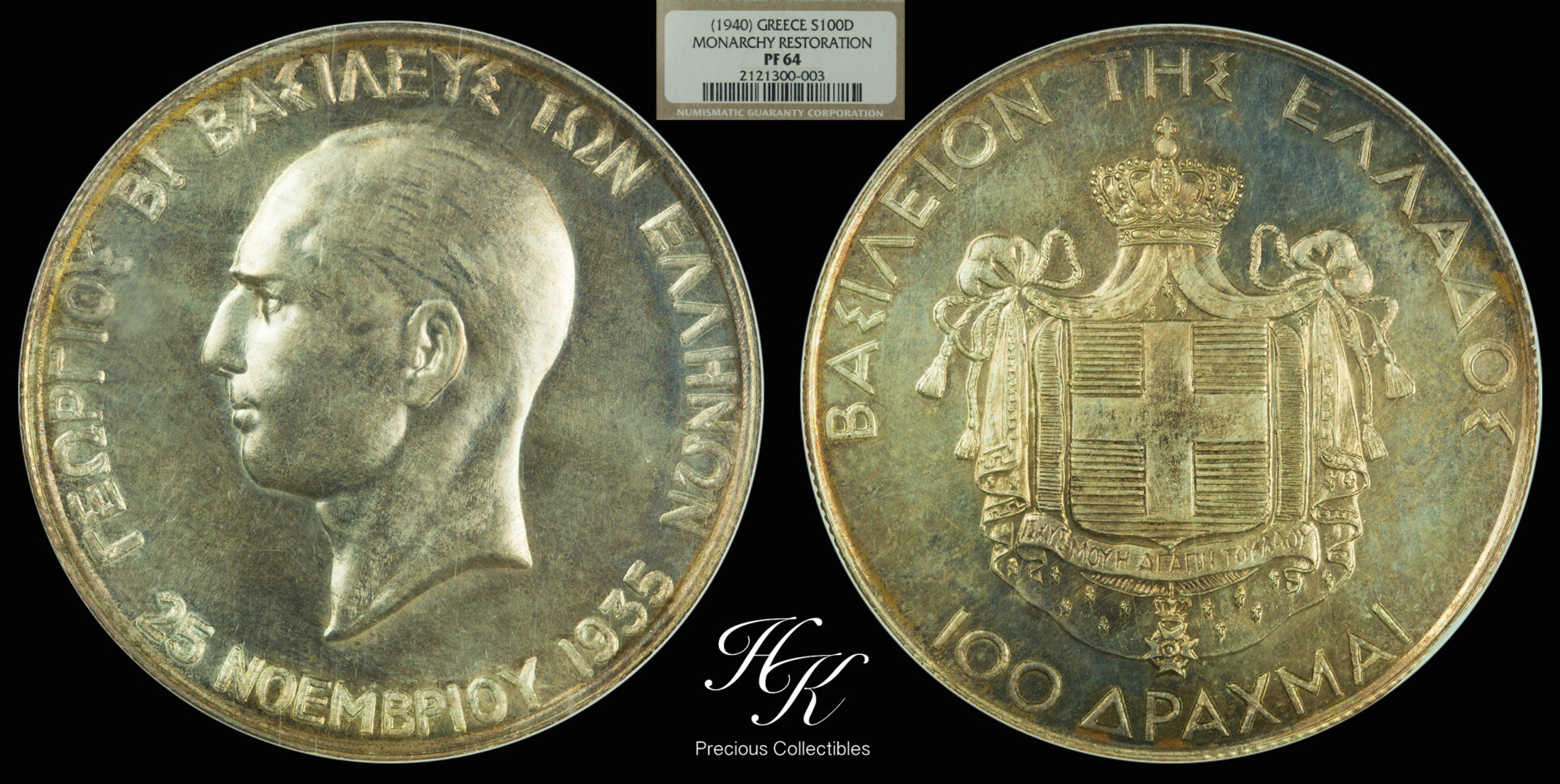 Ασημένιο Προυφ 100 Δραχμές 1935 (1940) “Γεώργιος 2ος” NGC PF64 Ελλάδα