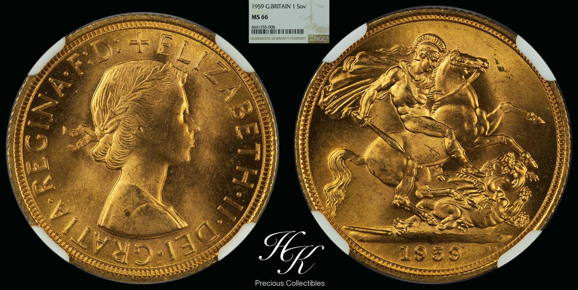 Χρυσή Λίρα 1959 Ελισάβετ II Πρώτο Πορτραίτο NGC MS66 Μεγάλη Βρεατανία