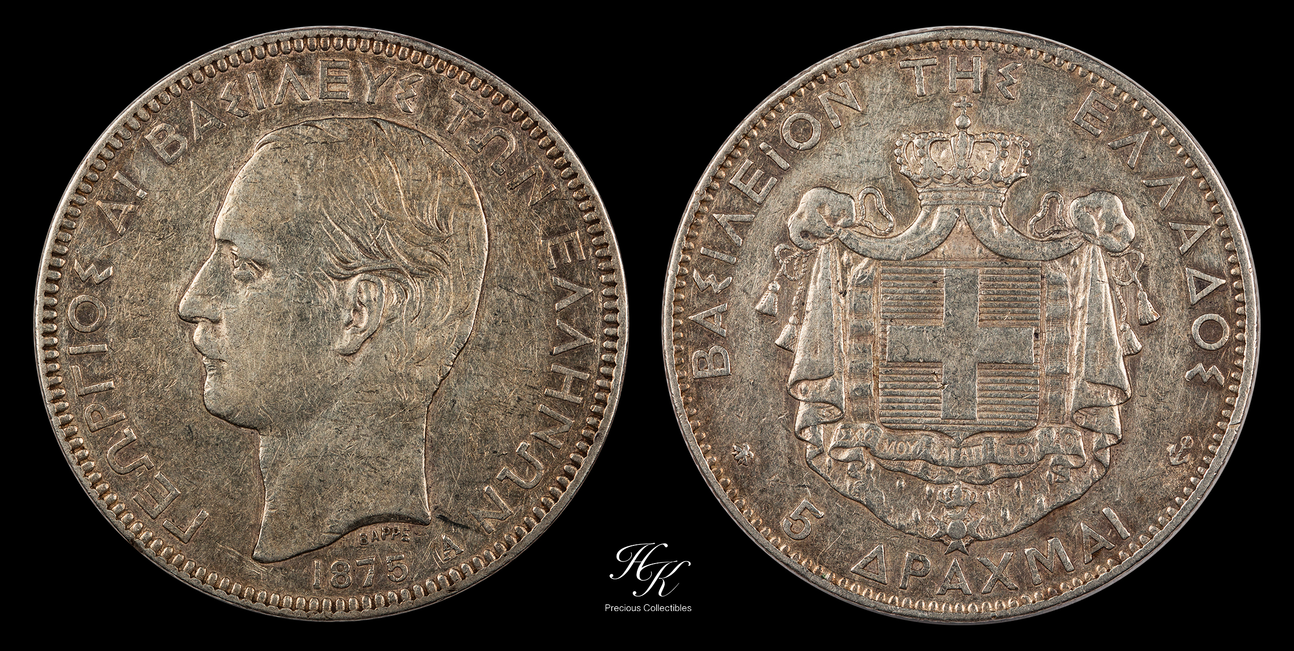 5 Δραχμές 1875 Βασιλιάς Γεώργιος Α Ελλάδα Κατηγορίες: Ασημένια νομίσματα, Όλα τα νομίσματα Περιγραφή Επιπρόσθετες Πληροφορίες Περιγραφή 5 Drachmai 1875 King George A Greece Great eye appeal . Επιπρόσθετες Πληροφορίες Χώρα Ελλάδα