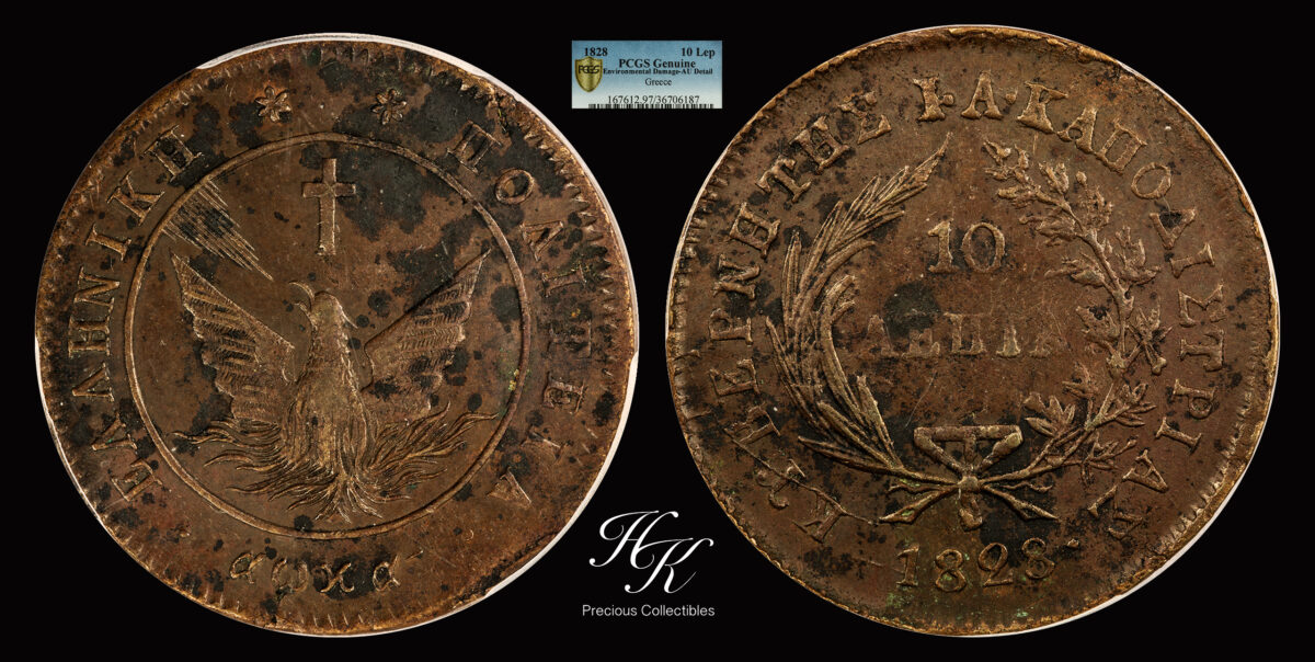 10 Lepta 1828 Variety 167 Governor Kapodistrias PCGS AU details Greece