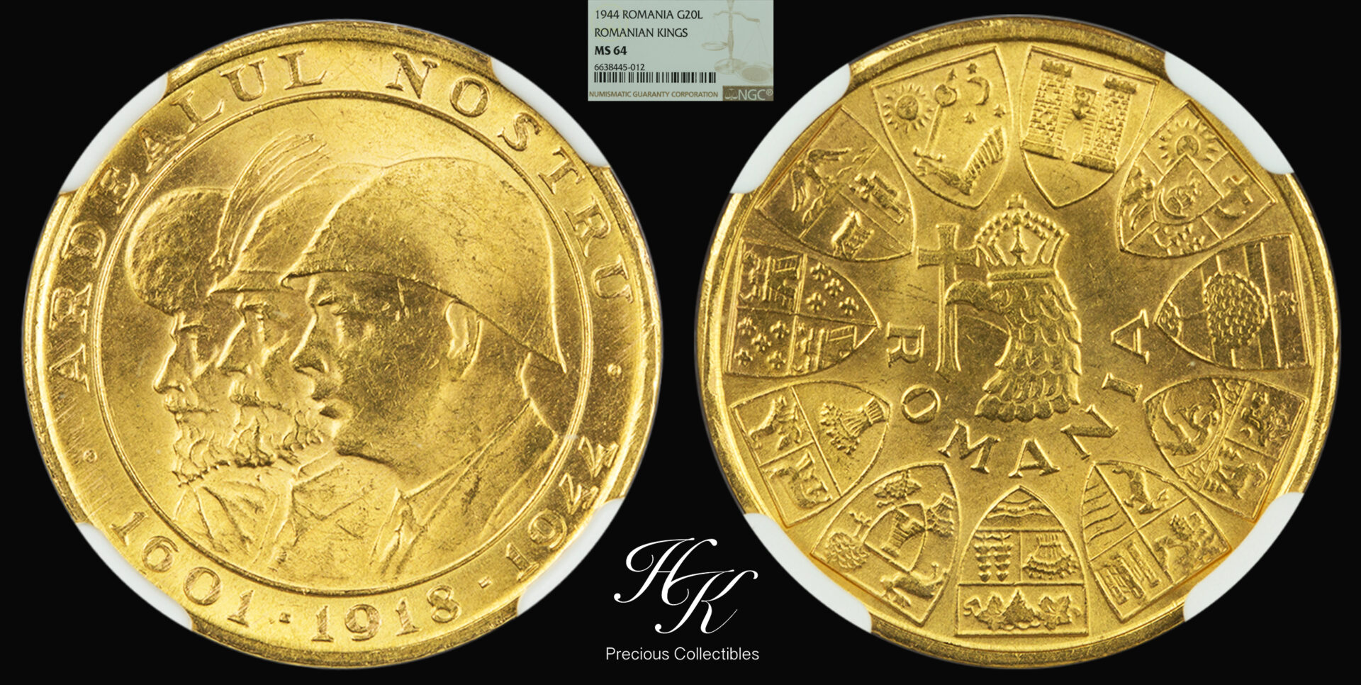 1944 20 LEI GOLD MEDALLION NGC MS64 ROMANIA
