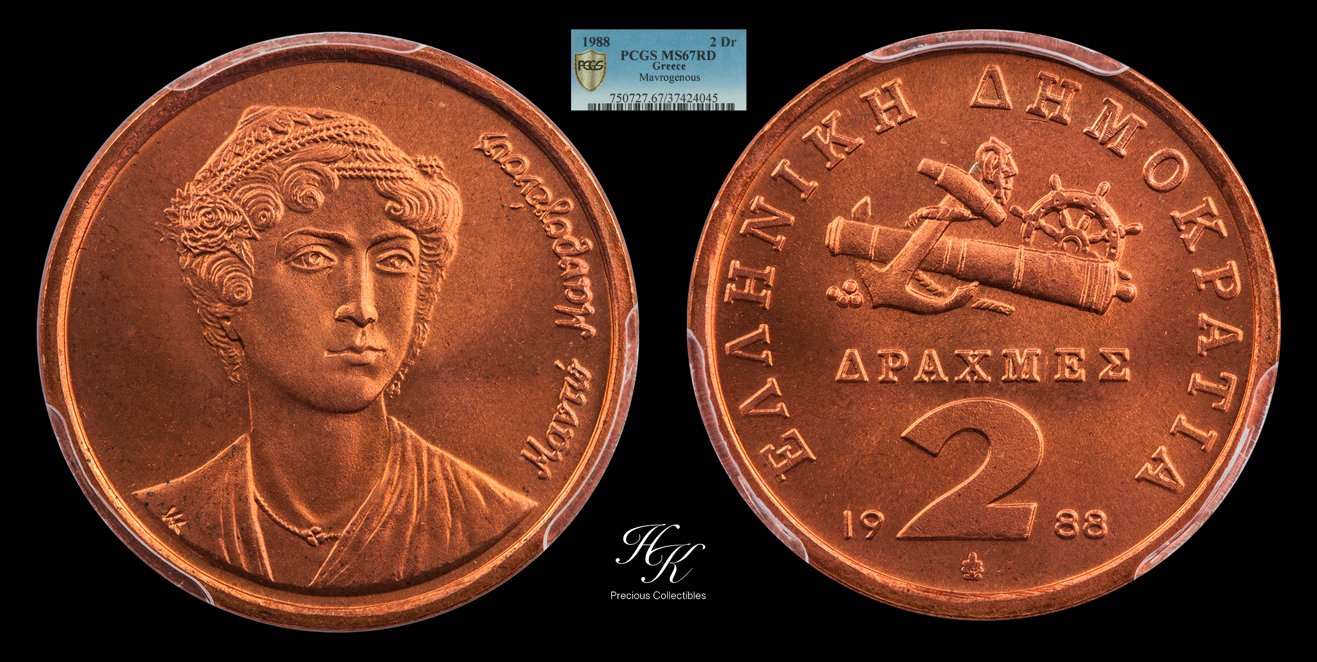 3. 2 Drachmai 1988 Mavrogenous PCGS MS67 RD Greece