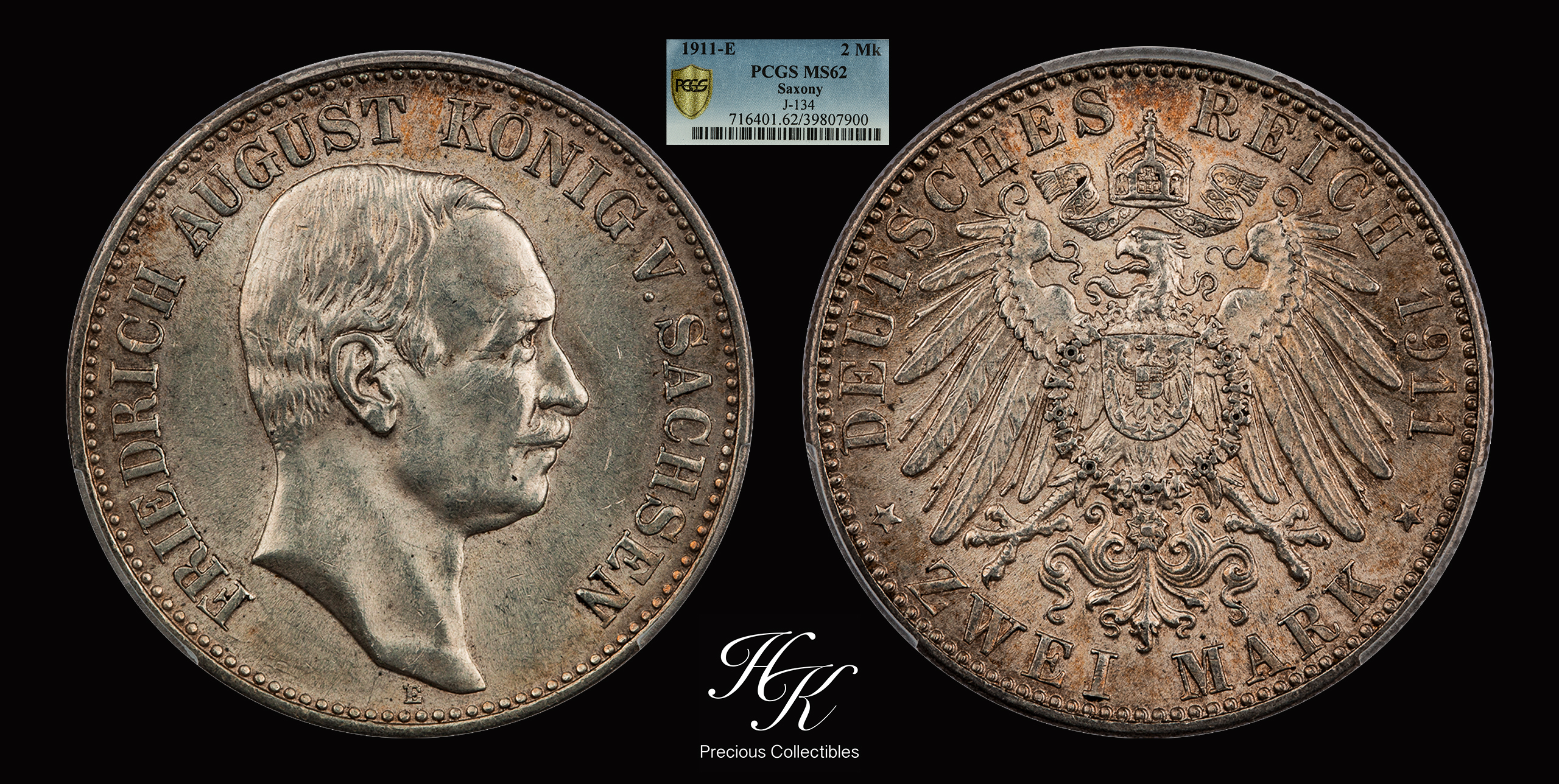2 Mark 1911 E Friedrich August III PCGS MS62 Saxony – German States – Germany