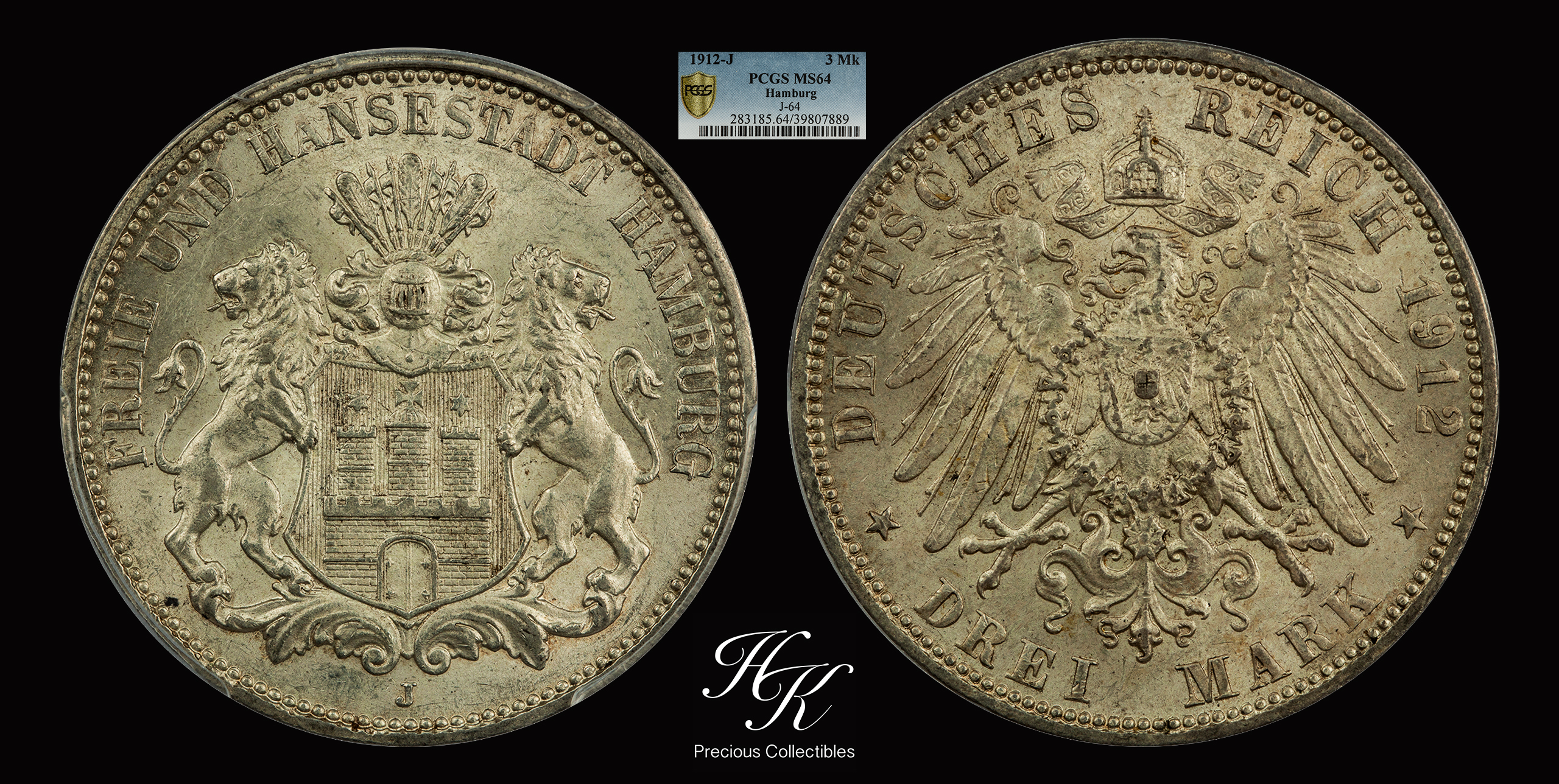 3 Mark 1912 J PCGS MS64 Hamburg – Germany Categories: All Coins, Silver Coins Description Additional information Description 3 Mark 1912 J PCGS MS64 Hamburg – Germany Mintage : 491,088 Additional information Country Germany
