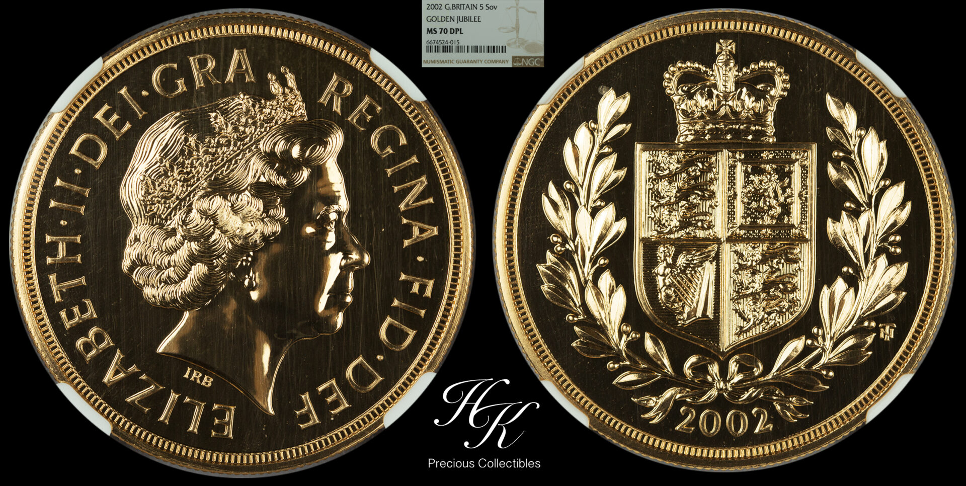 5 Pound 2002 “Shield” MS 70 DEEP PROOF LIKE quintuple sovereign Elizabeth Great Britain