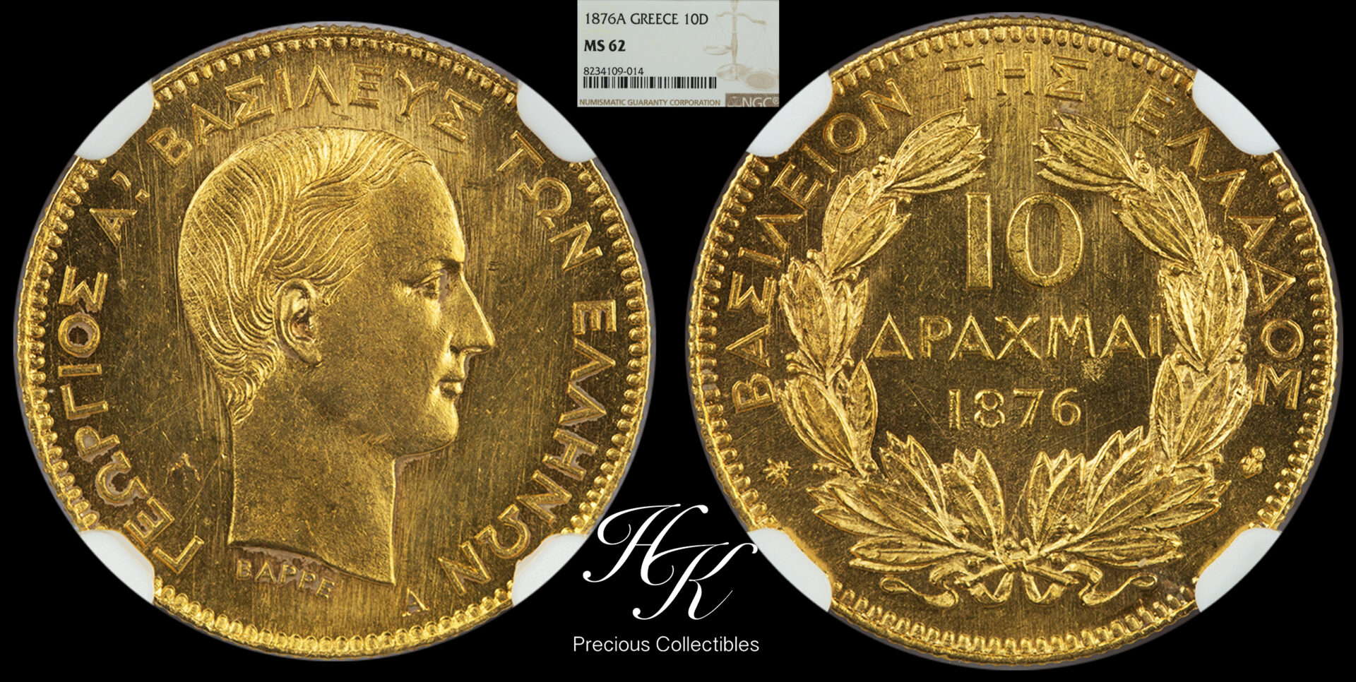 Gold 10 drachmai 1876 A “King George A” NGC MS62 Greece