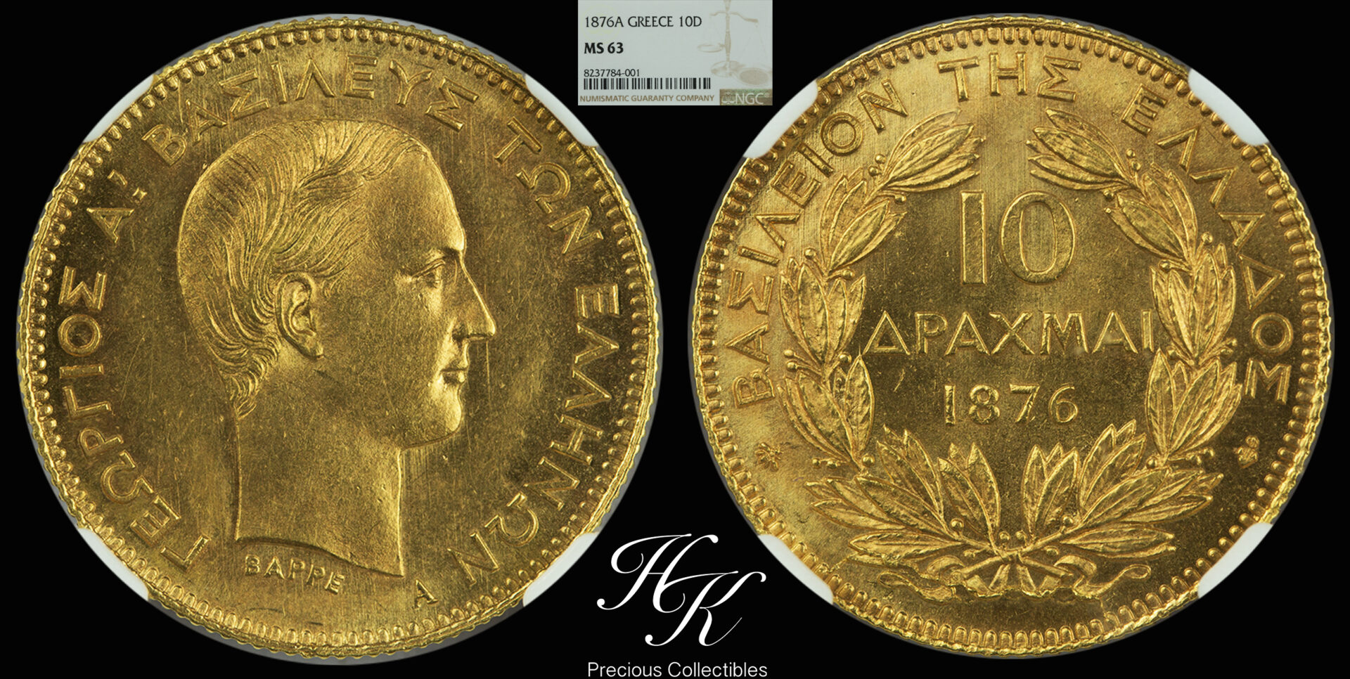 Gold 10 drachmai 1876 A “King George A” NGC MS63 Greece