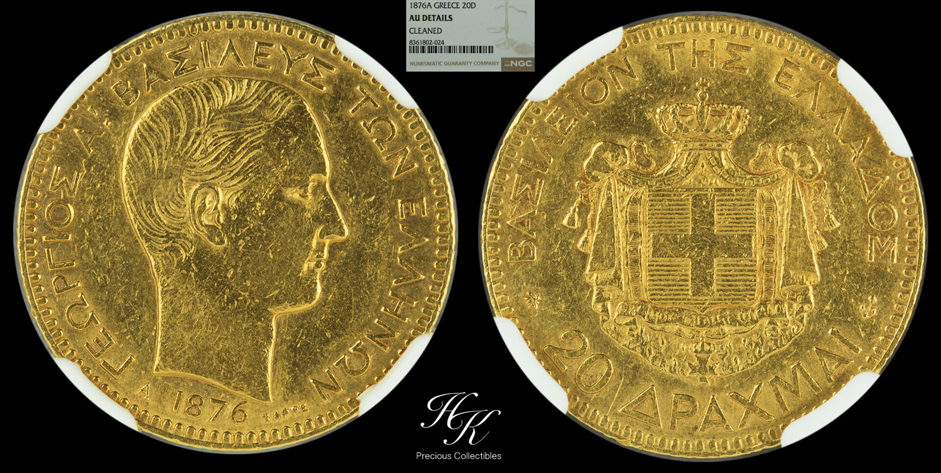 Gold 20 drachmai 1876 A “King George A” NGC AU DETAILS CLEANED Greece