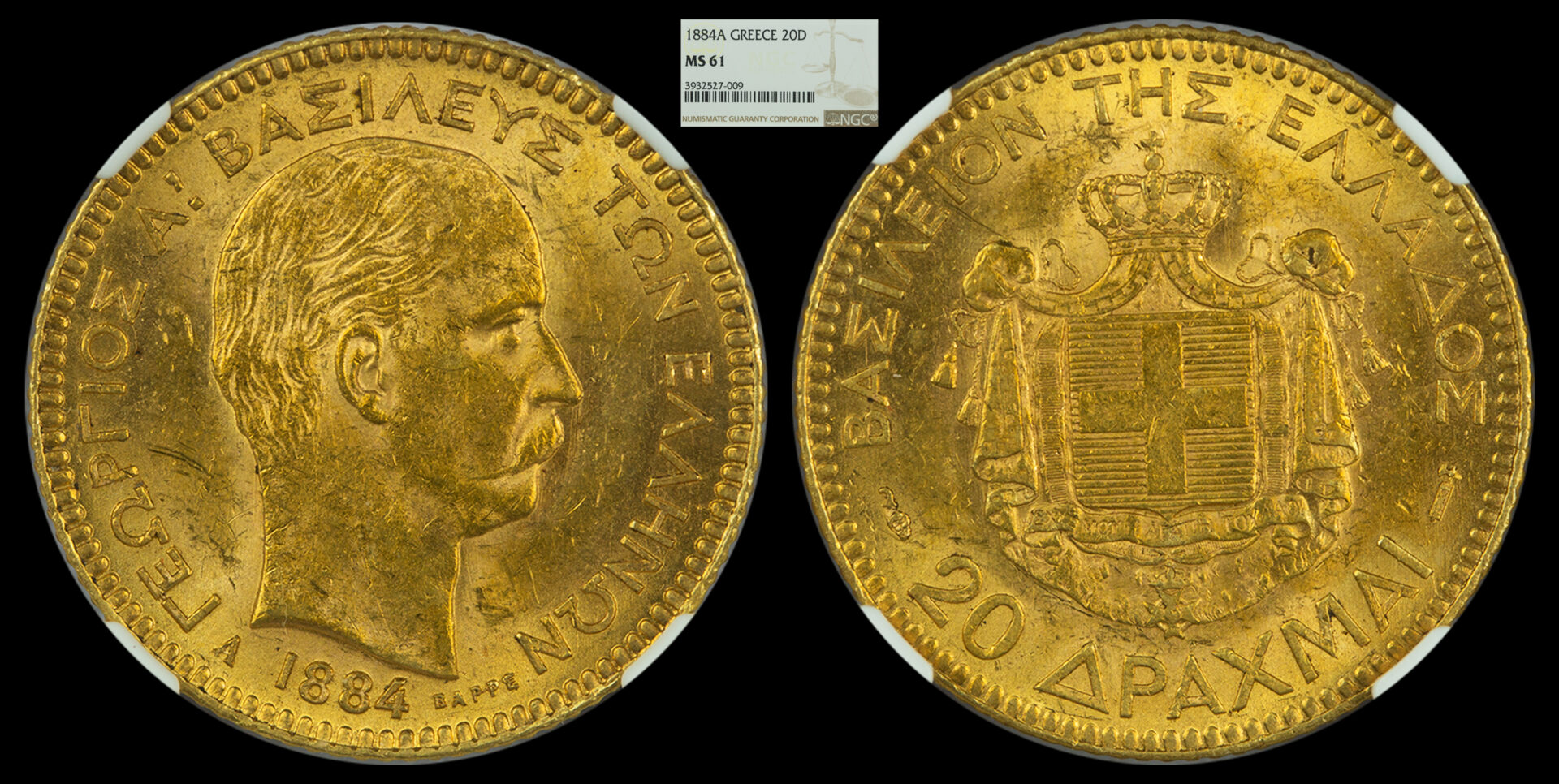 Gold 20 Drachmai 1884 A (King George A ) NGC MS61 Greece