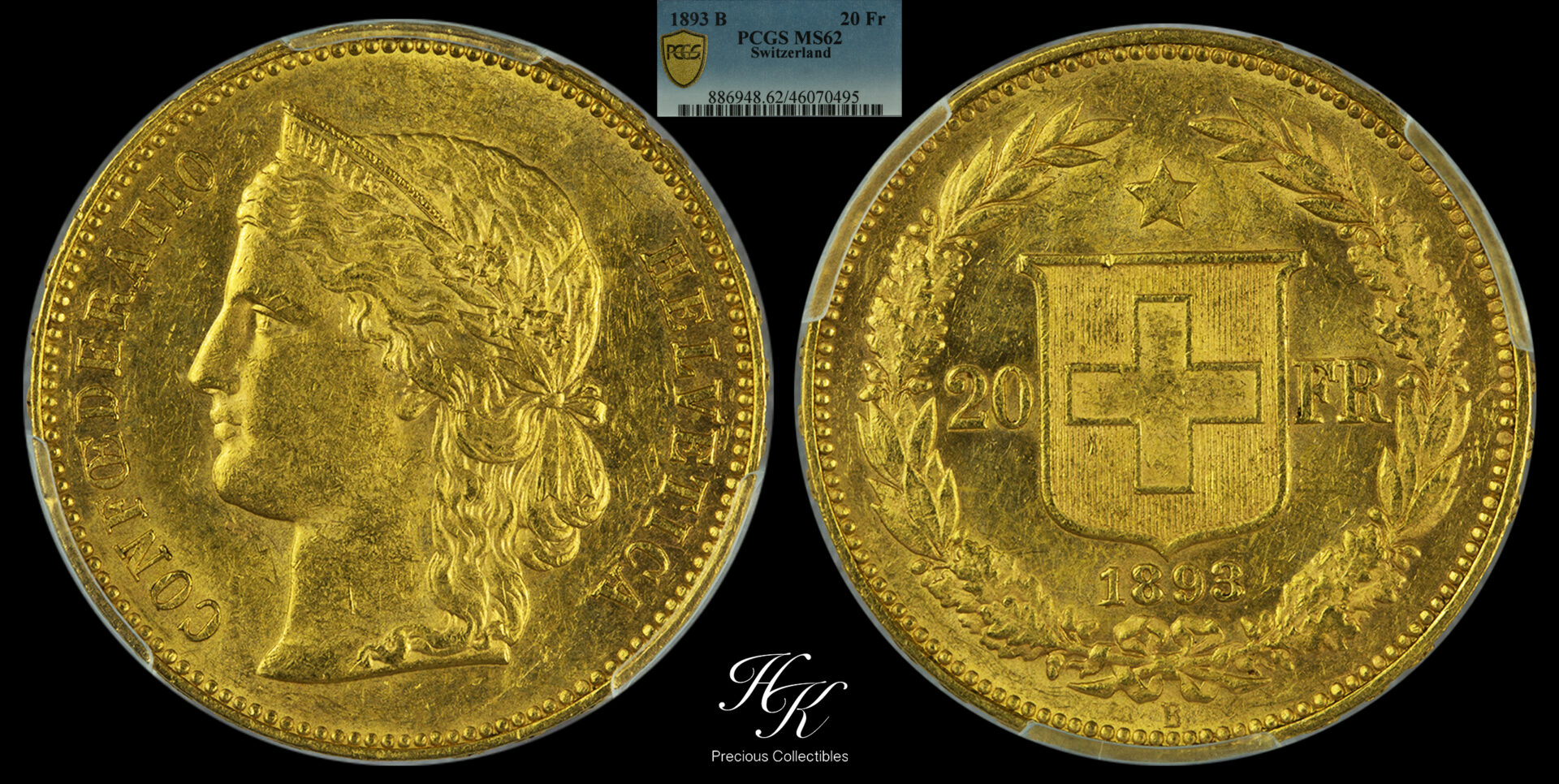 Gold 20 francs 1893 B -Libertas- PCGS MS62 SWITZERLAND