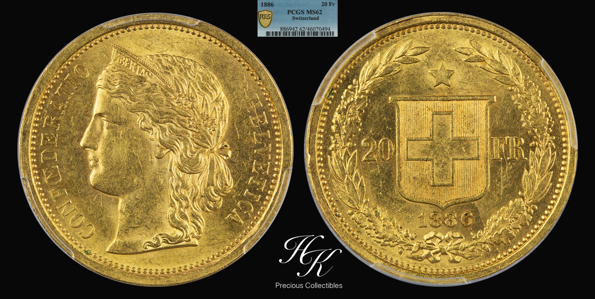 Gold 20 Francs (Libertas) 1886 PCGS MS62 Switzerland