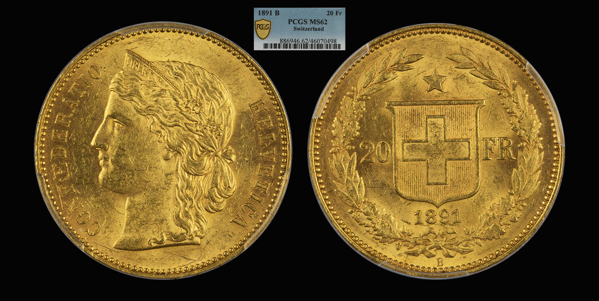Gold 20 Francs (Libertas) 1891 B PCGS MS62 Switzerland