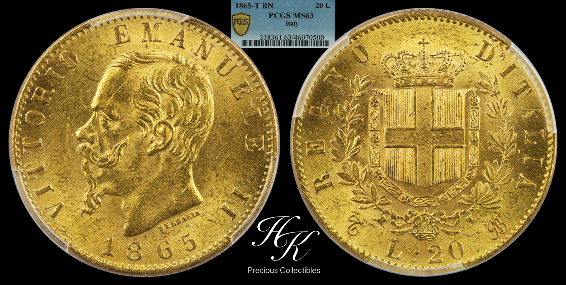 Gold 20 Lire 1865 – Victor Emmanuel II – PCGS MS63 Italy