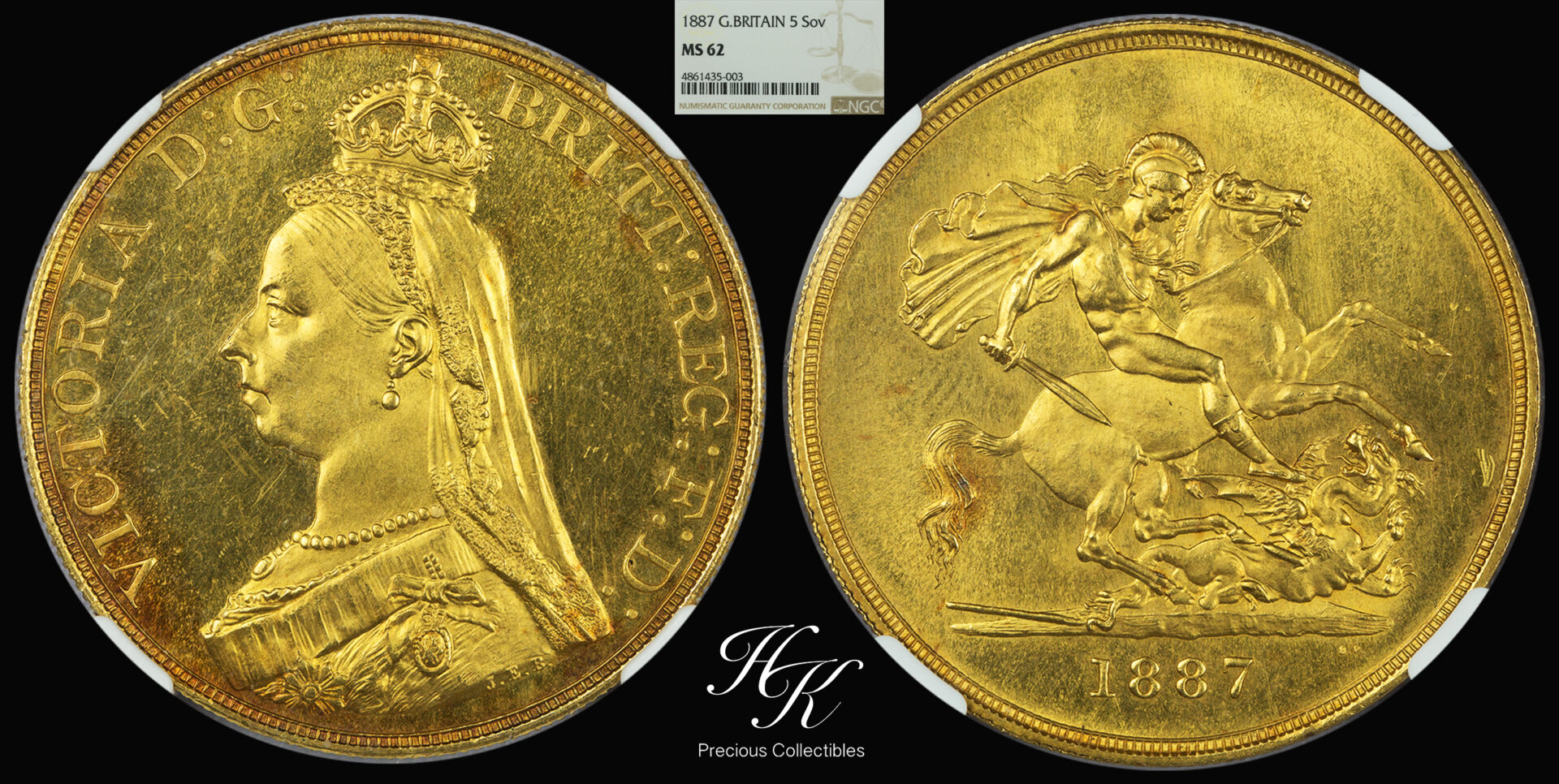 Gold 5 Pounds (quintuple sovereign) 1887 “Victoria” NGC MS62 Great Britain