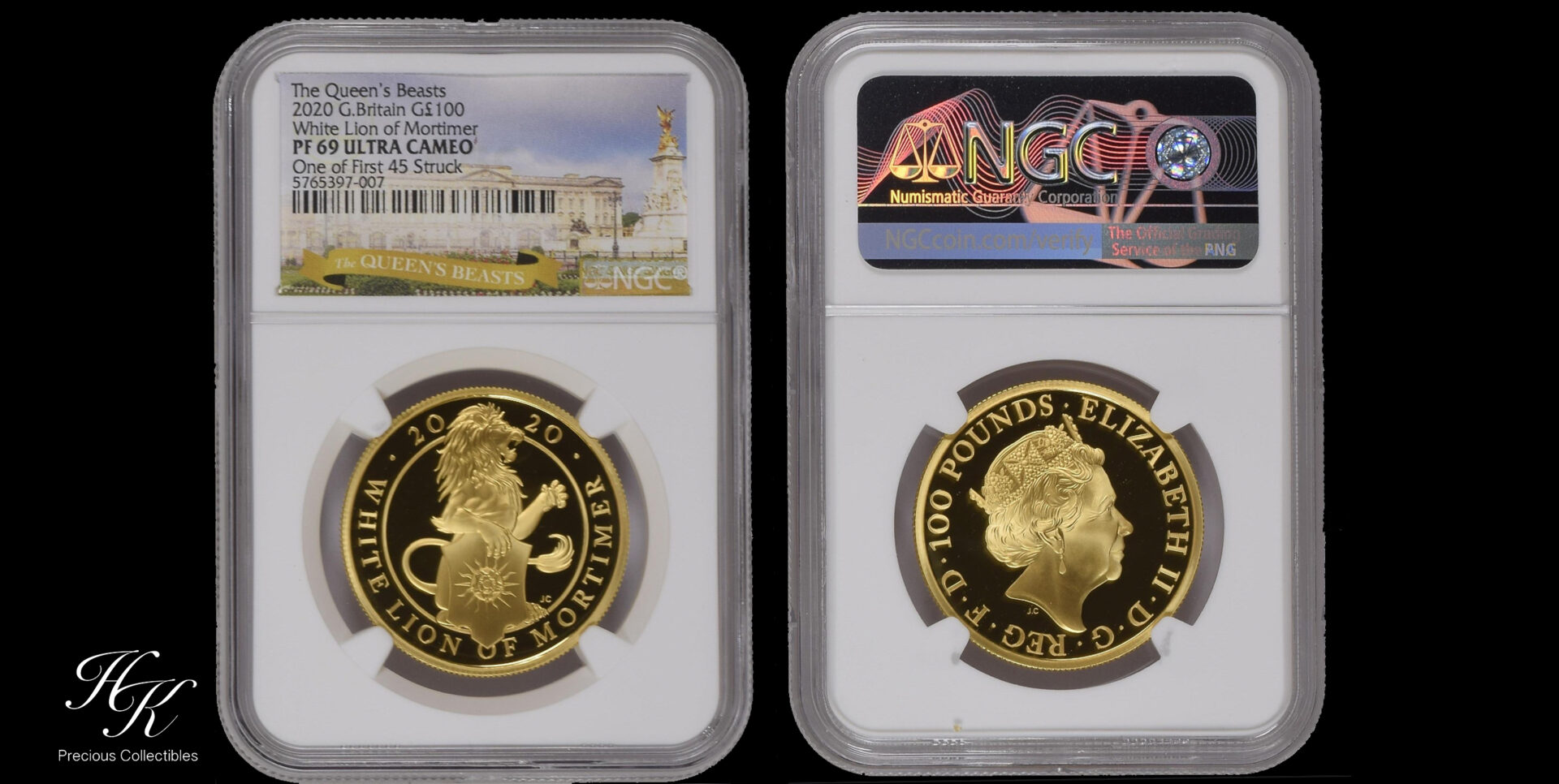 Gold proof 100 Pounds – Elizabeth II – White Lion of Mortimer 2020 NGC PF69 ULTRA CAMEO Great Britain