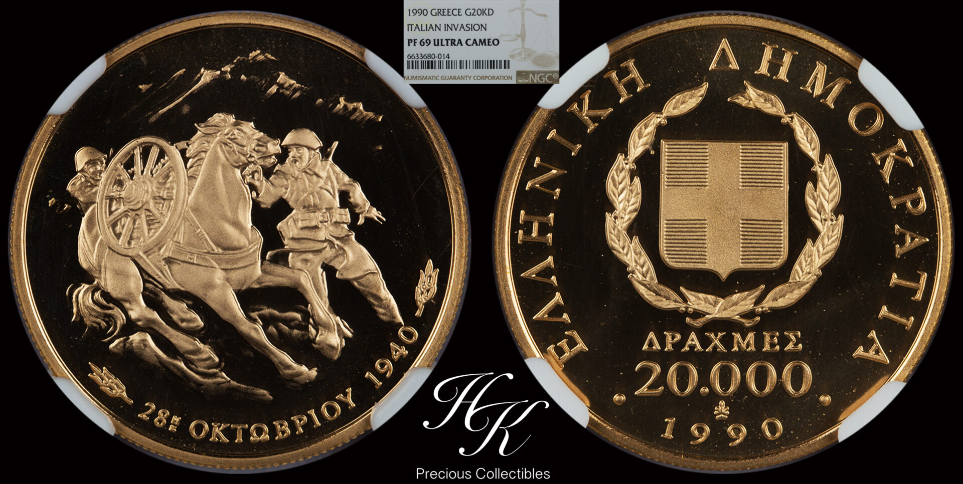 Gold proof 20 000 Drachmes “Italian Invasion of Greece” 1990 NGC PF69 ULTRA CAMEO Greece