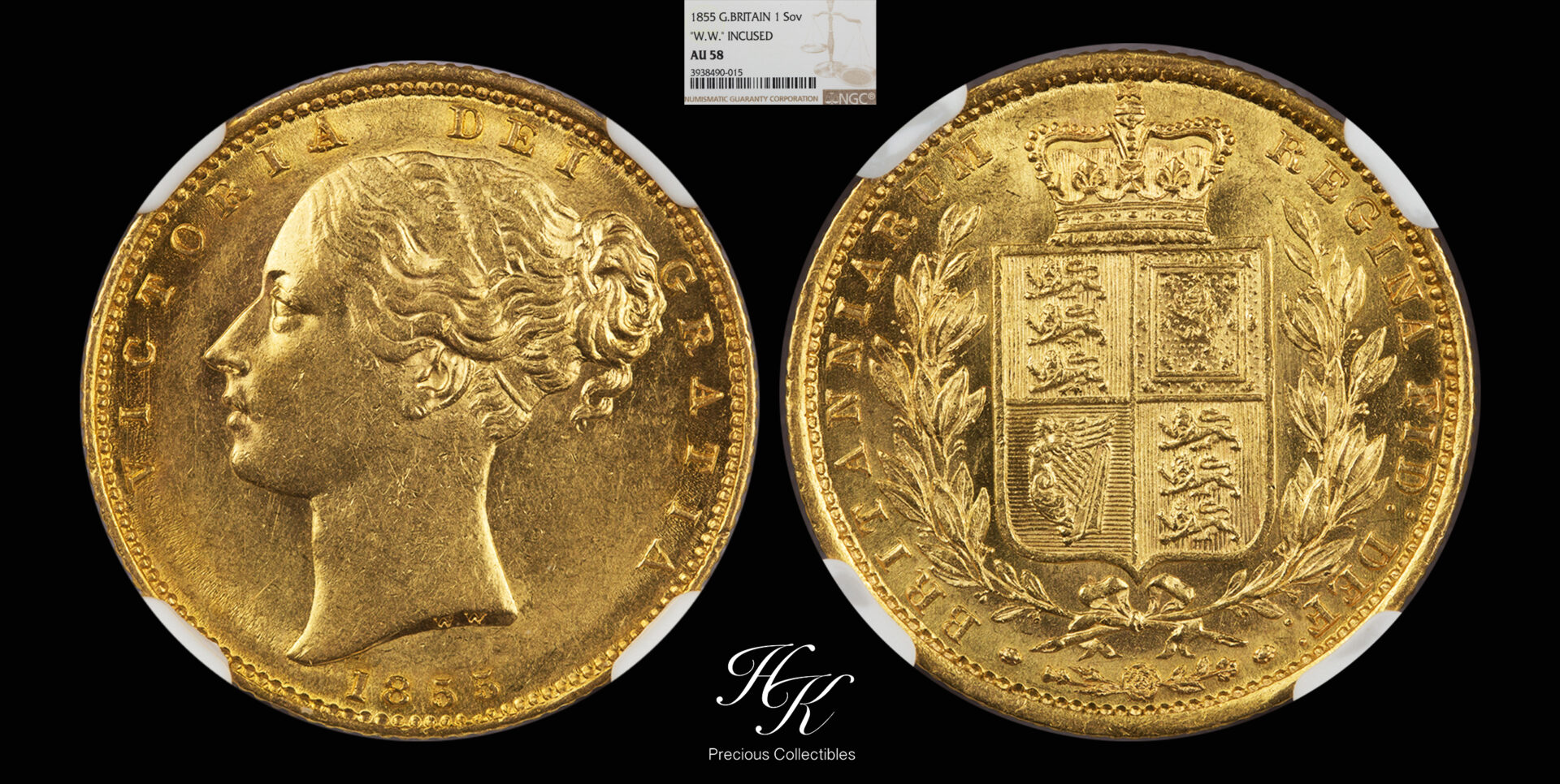 Gold sovereign 1855 “VICTORIA – SHIELD” NGC AU58 Great Britain