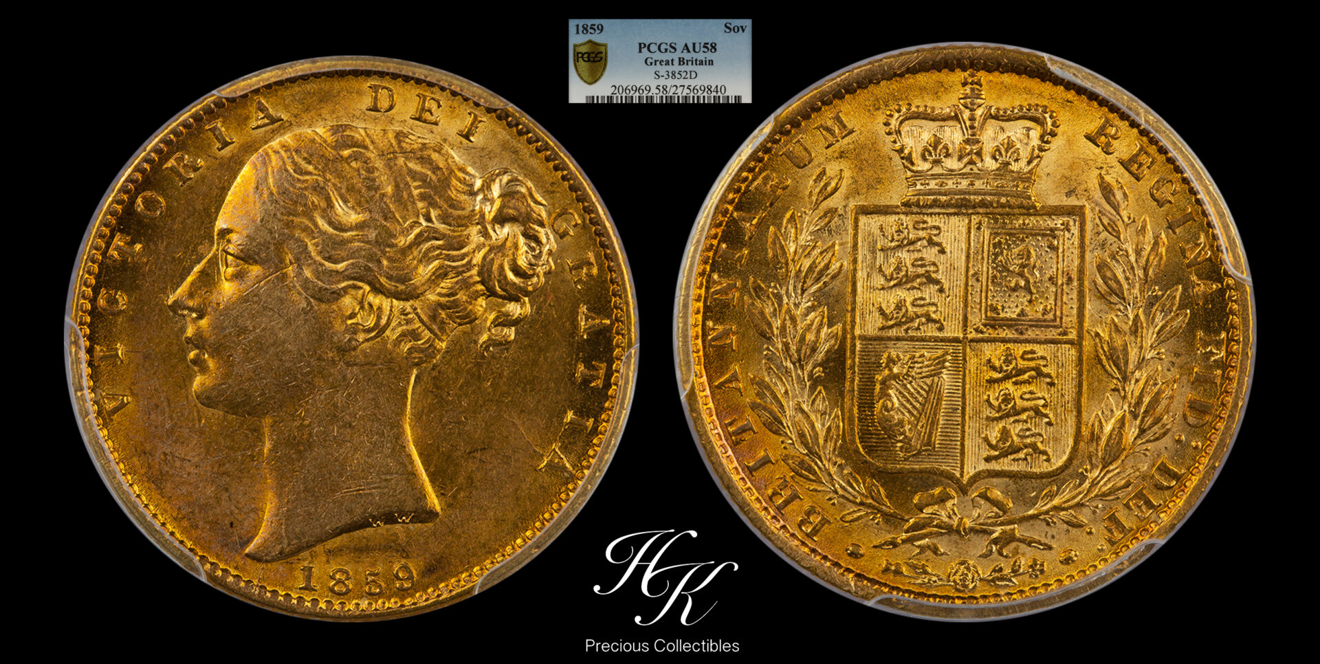 Gold sovereign Shield 1859 RARE “Victoria” PCGS AU58 Great Britain