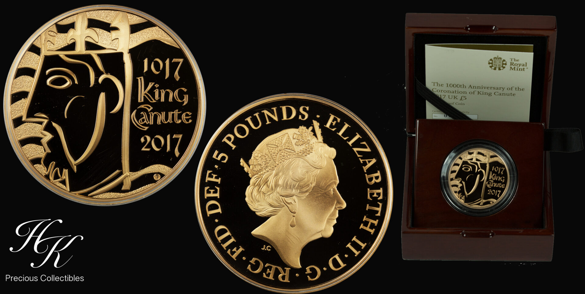 In 2017, to celebrate the 1000th Anniversary of the Coronation of King Canute, the Royal Mint released a Limited Issue King Canute £5 Five Pound Gold Proof Coin struck in solid 22 Carat Gold.