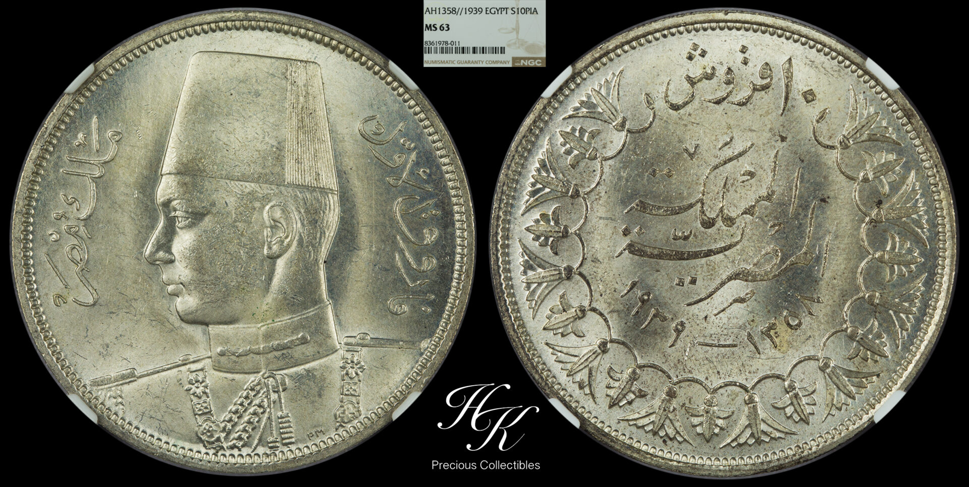 Silver 10 Qirsh / Piastres – Farouk – 1939 (1358) NGC MS63 Egypt