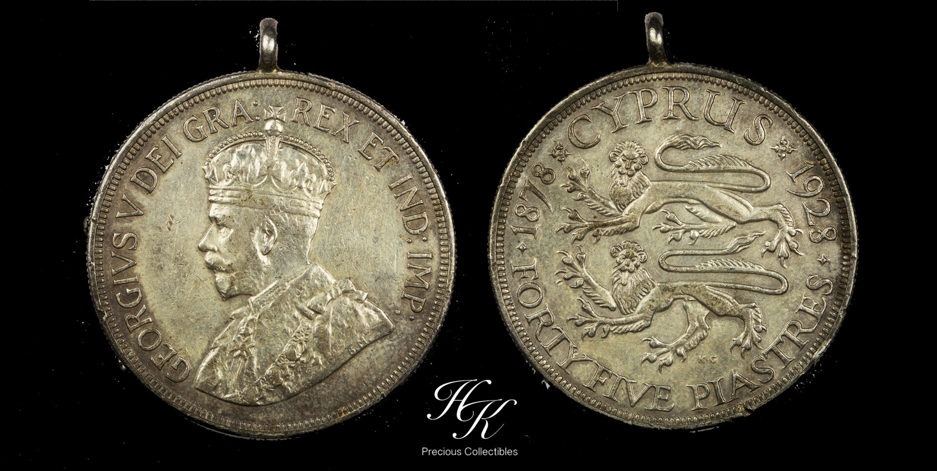 Silver 45 Piastres 1928 – George V – WITH HOOP Anniversary of Cyprus