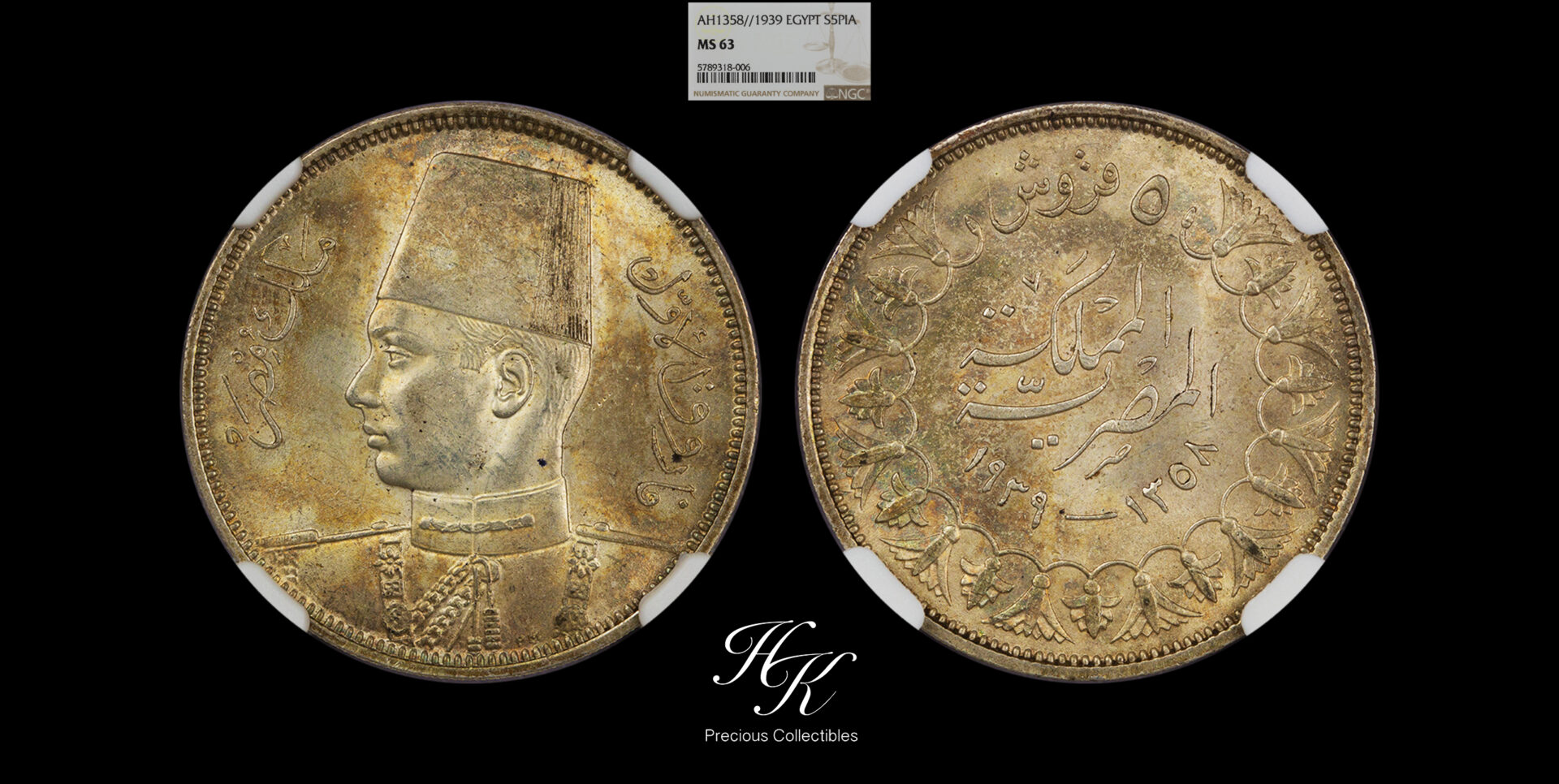 Silver 5 Qirsh (Piastres) – Farouk – 1939 NGC MS63 Egypt