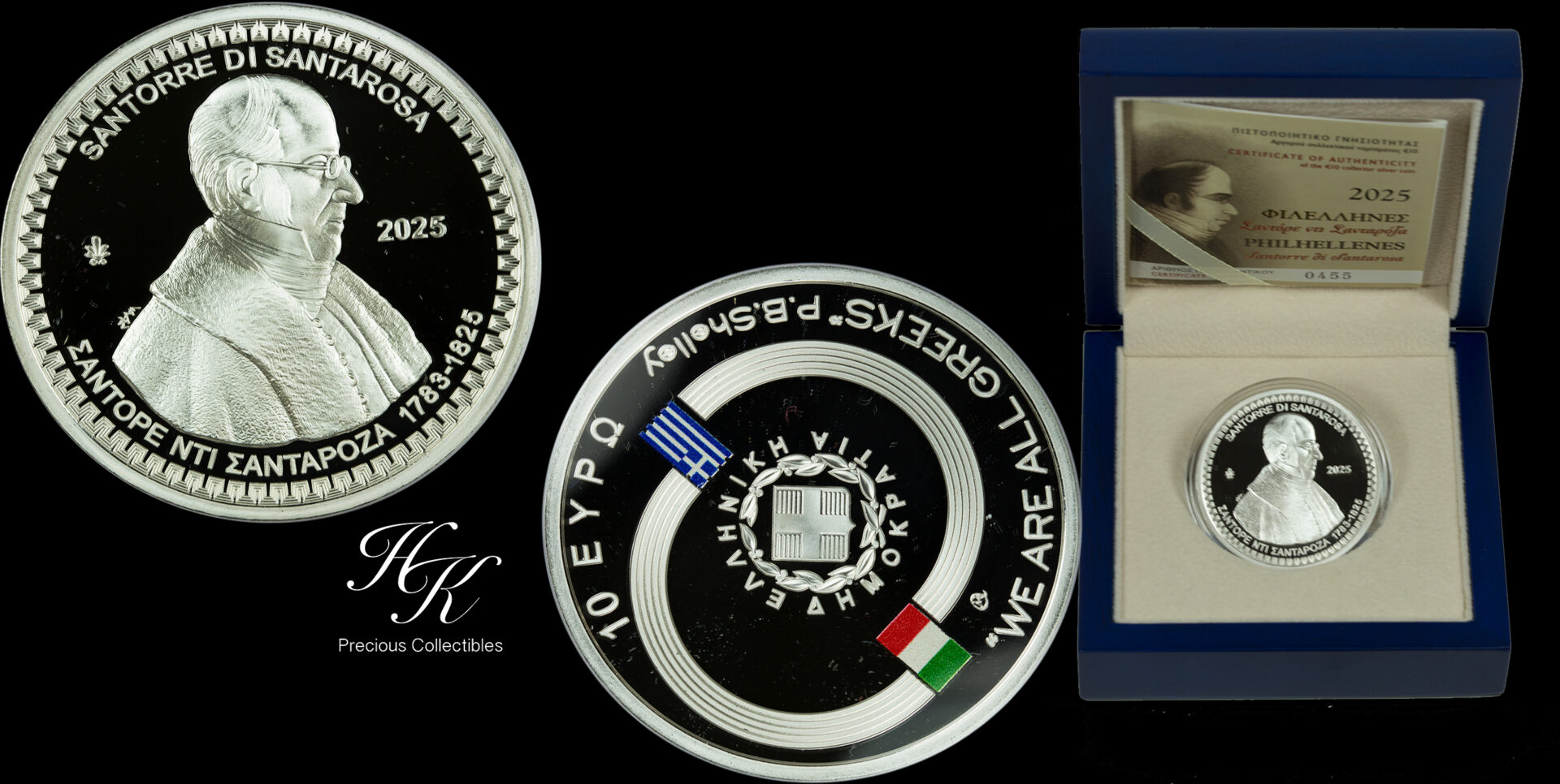 Greek collectible silver proof coin with a face value of 10 euros, for the SANTORRE DI SANTAROSA, maximum number of 1,000 pieces, Bank of Greece mint, issued in 2025.